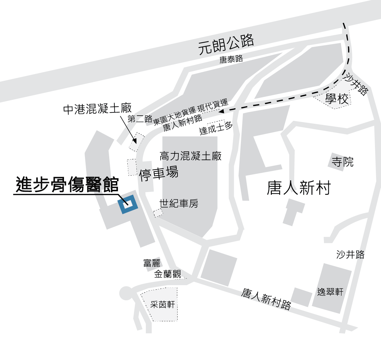 在唐人新村路,近中港混凝土廠,藍色大門上有「進步」和黑狗的標誌下車或泊車 (敬請通知)。